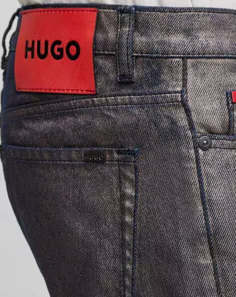 Occasion-ready jeans by HUGO Menswear. Delivered in a metallic effect for contemporary edge, these statement jeans are cut to a tapered fit with a regular-rise waist detailed with a logo patch. The denim is crafted from pure cotton for a breathable feel.