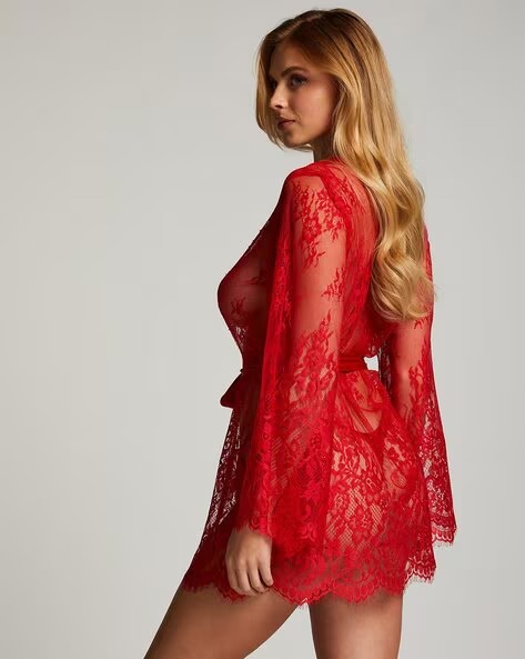 This kimono has it all: sexy, feminine and lots of lace. It is made from transparent lace with satin details and has a button-up front.