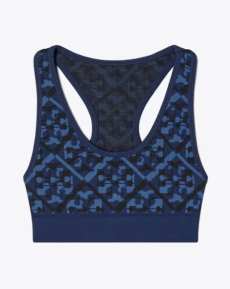 A racerback sports bra is elevated in prismatic t monogram jacquard. For a streamlined set, pair the medium-support bra with the matching seamless legging.