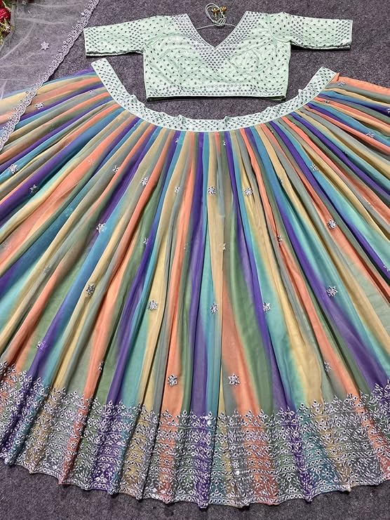 Lehenga Fabric :-Faux Georgette and Digital Print Inner :- Micro Silk Work :- Multi Needle Work, Sequence 9mm Work, Coding work, Embroidery Work, Zari Work. Less