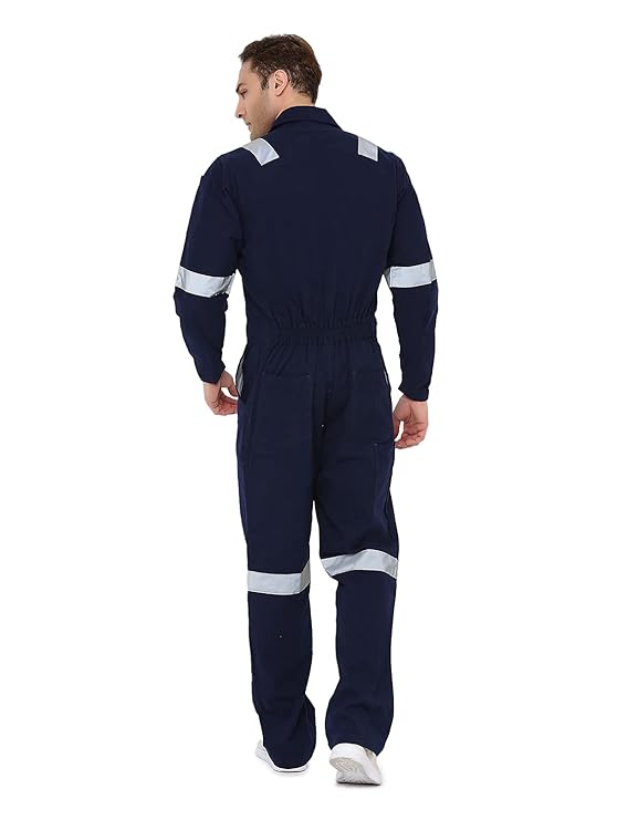 100% COTTON mercerised Peach Finish Premium Fabric in 240 gsm 2 front pockets with velcro, 2 side pockets, 1 tool pocket, 1 sleeve pocket and 2 back pockets For high visilibility, 2 inch reflective radium tapes have been stitched on the shoulder, sleeves and on the knees