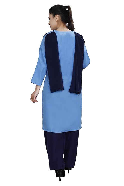 Readymade Stitched Fabric Set: Suit, Salwar and Dupatta. Salwar Suit Fabric: Poly Cotton. Chunni Fabric: Chiffon. Straight fit, round neck, calf length Kurta with Salwar.