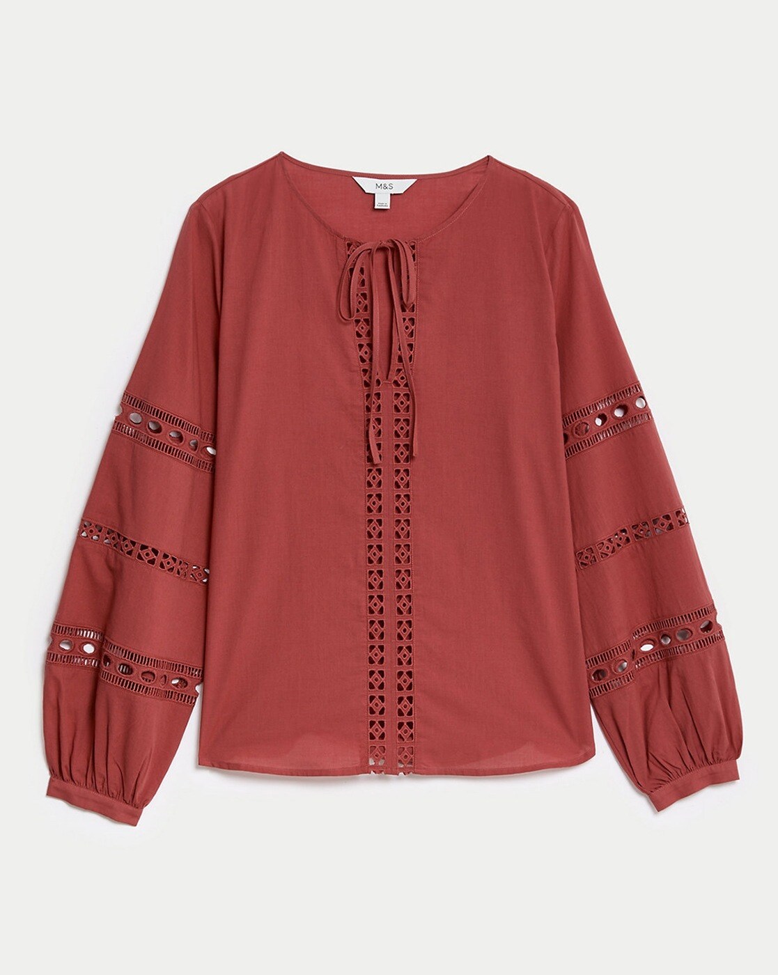 This pure cotton blouse is crafted with intricate broderie detailing to give an elegant feminine look. Easy regular fit, with a neat tie fastening at the crew neck. The long sleeves are finished with stretchy cuffs for a comfy feel. M&S Collection: easy-to-wear wardrobe staples that combine classic and contemporary styles.