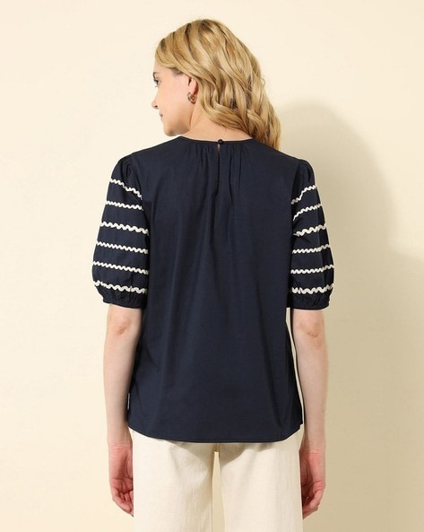 Round neck , Gathered near yoke Button and loop closure at back , Short sleeves with ric-rac lace detail Straight hemline , Solid pattern