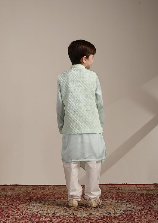Package Contains: Jacket | Pyjama | Kurta | Brooch Style:A perfect blend of conventional and contemporary designs, this aqua blue kurta jacket set is tailored in an Angrakha silhouette and adorned with ogee patterns. The embroidered neckline, draped hem and pearl buttons lend it a regal festive appeal.