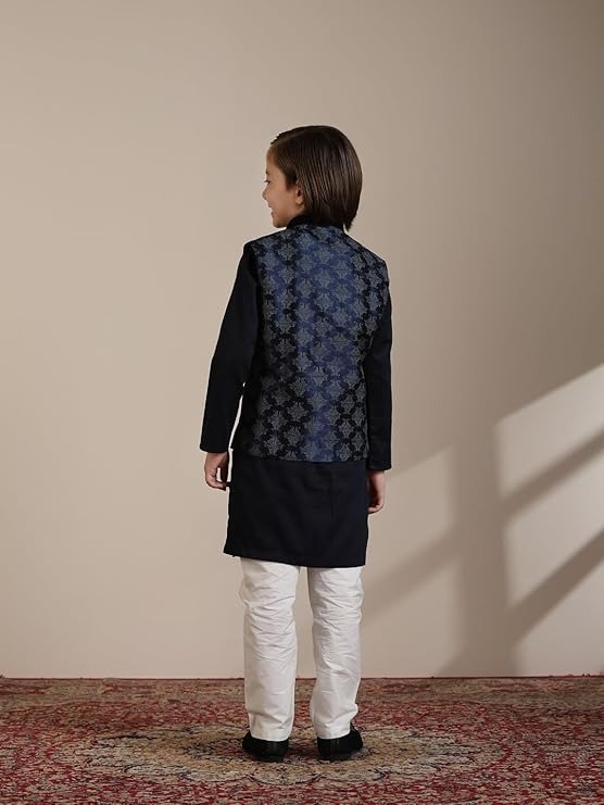 Package Contains: Jacket | Pyjama | Kurta Style:This navy blue kurta jacket set is adorned with an imperial jaal pattern, exuding an aura of regal sophistication. The jacket features a front-buttoned placket with ornate potli buttons and metallic thread embroidery on the bandhgala collar. It is paired with a matching solid-colored kurta with cuffed sleeves that complement the jacket's imperial design.