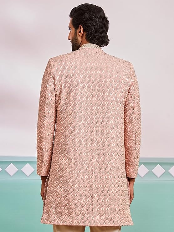 Fabric: Rayon | Contents: a This men's embroidered kurta, pant set blends traditional craftsmanship with contemporary elegance. This men's embroidered Indo-Western is a perfect fusion of tradition and modern elegance. intricate gold embroidery in a geometric pattern.A structured yet relaxed fit with a straight-cut silhouette.