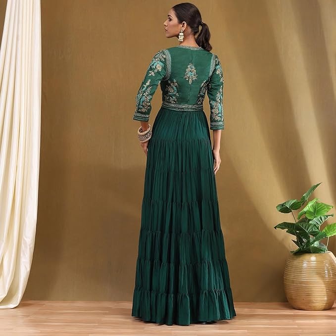 Product Type:- Dresses Fabric:- Silk Color:- Emerland Green Neck:-Straps Sleeve:- 3/4 Sleeves