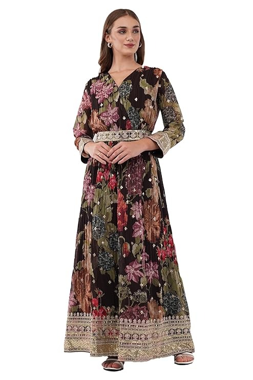 Premium Georgette Crape Fabric for Comfort: Our Anarkali set is composed of soft and breathable Georgette Crape which guarantees a comfortable fit throughout the day. Being lightweight and smooth on the skin, this woman's outfit provides a relaxed feel without compromising style. Versatile Style: Featuring modern intricate detailing and rich colours, this woman's kurti set combines traditional elements with contemporary style, creating a versatile design that’s perfect for any occasion. Elegant Flowy Fit for All Body Types: This elegant Woman's Ethnic Wear gives a graceful, flowing fit that flatters your figure and adds a sense of movement to your overall appearance, making it a timeless choice.q