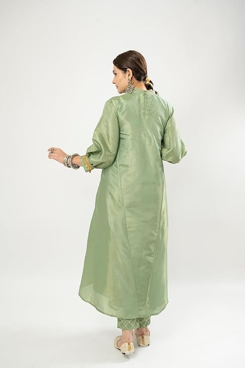 ABOUT THE PRODUCT: Style- Suit set with Embroidery | Length- Calf length | Type of sleeve- 3/4 length | Neck Style- Square | Colour- Pista MATERIAL: The MIORAH Traditional Suit Set features a regular fitted V-neck kurta made from exquisite zari tissue, paired with a pant crafted from Jamdani zari butti, and Organza dupatta, creating a traditional craftsmanship and modern elegance VERSATILE OUTFIT: Ideal for a wide range of occasions, this outfit is perfect for festive celebrations, family gatherings, or sophisticated evening events. Its versatility ensures that you can wear it to various functions and always look your best