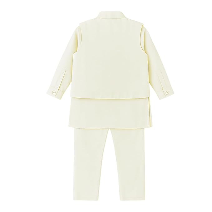 Premium Fabric Blend - Cotton Magic & Satin: Crafted with a unique combination of Cotton Magic and Satin, this kurta pajama set ensures superior softness, breathability, and a subtle sheen that gives your child a rich, elegant appearance while keeping them cool and comfortable all day long. Complete Ethnic Outfit - This set includes a traditional kurta, straight-cut pajama, and a beautifully embroidered Nehru jacket, offering a complete festive look in one convenient package. The coordinated design makes it easy to dress your child in traditional Indian attire with modern flair.